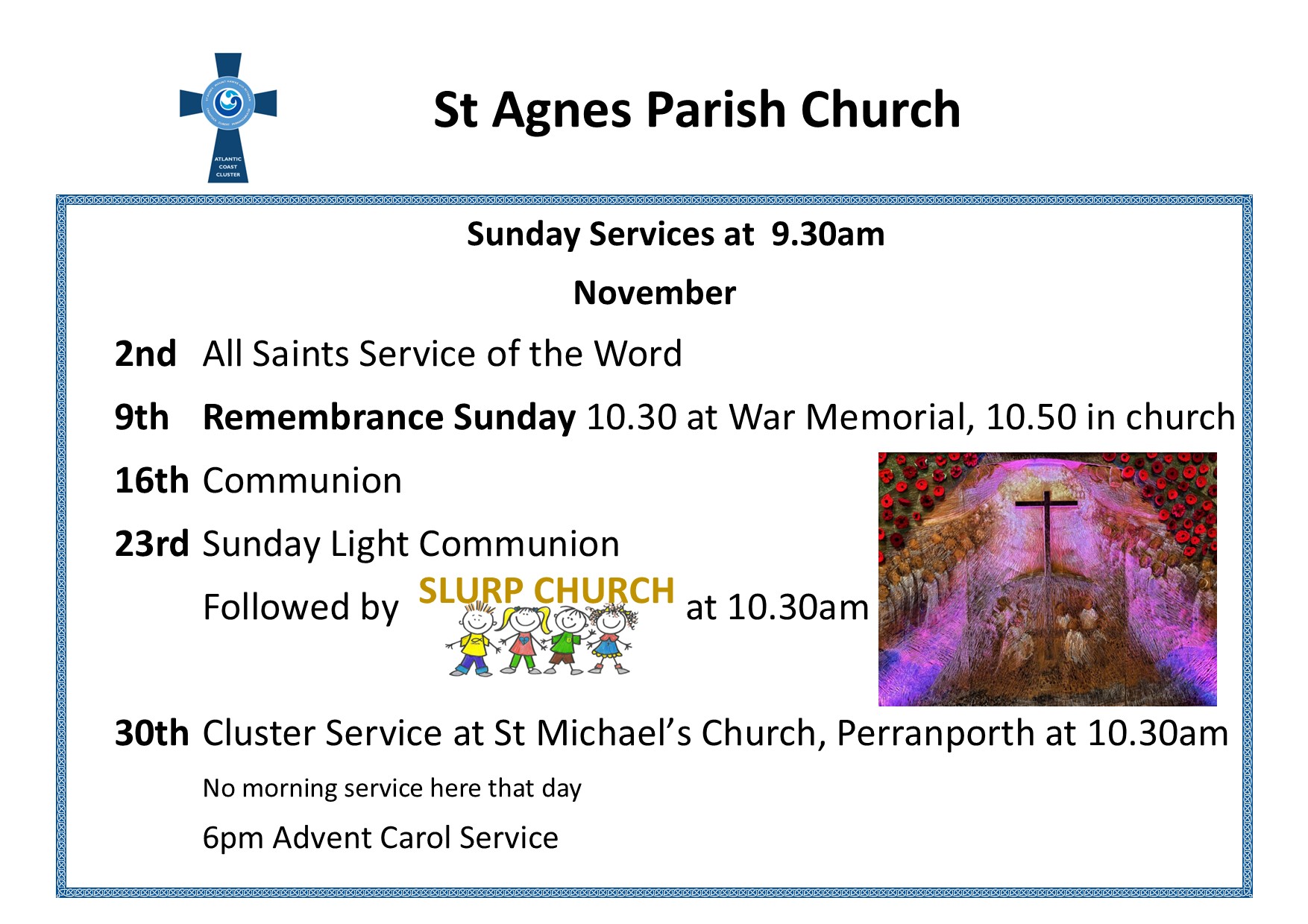 Calendar - shows all the services for all the churches - if you just want the ones for St Agnes select that using the drop down list.