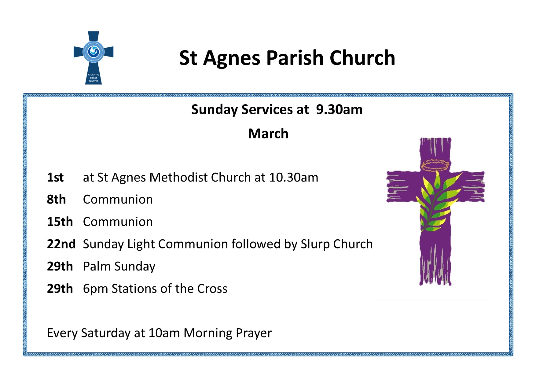 Calendar - shows all the services for all the churches - if you just want the ones for St Agnes select that using the drop down list.